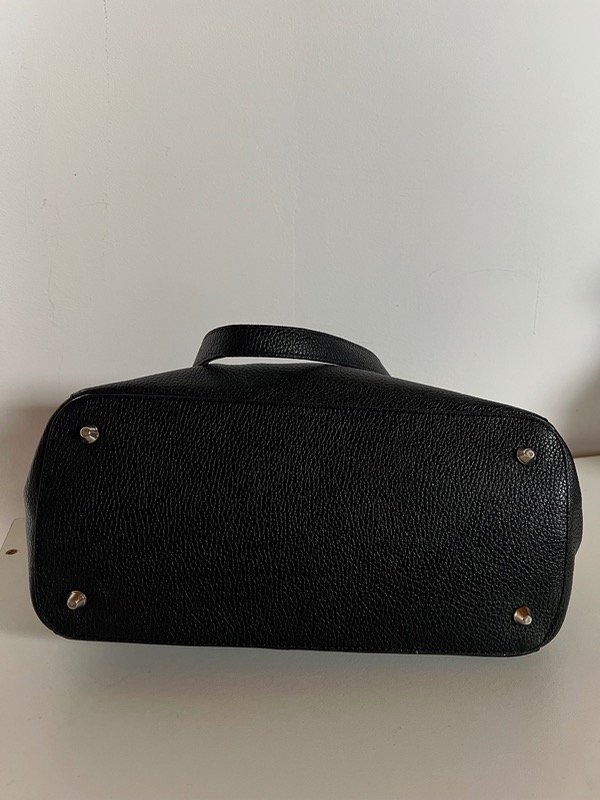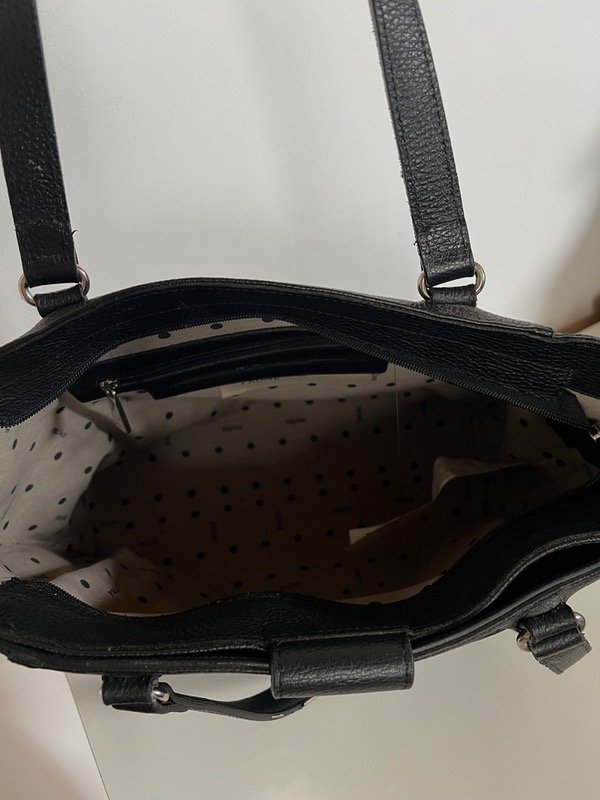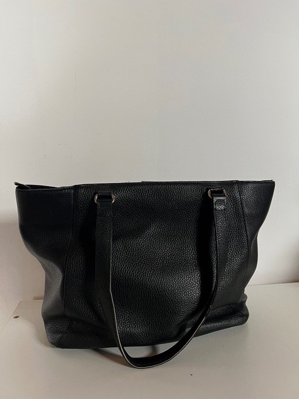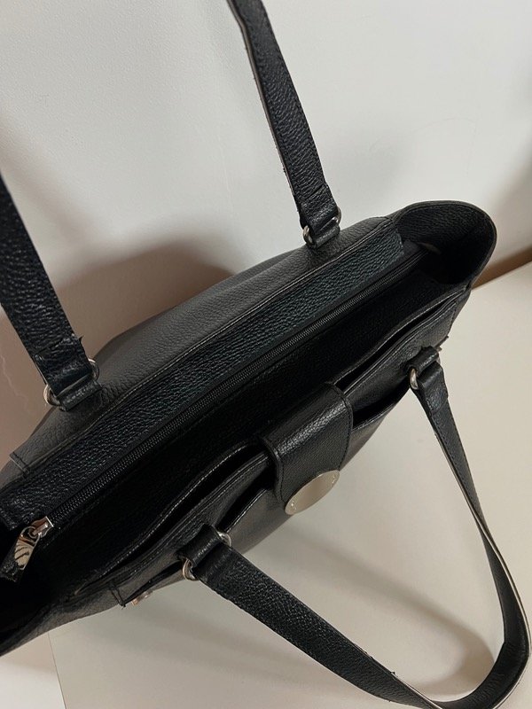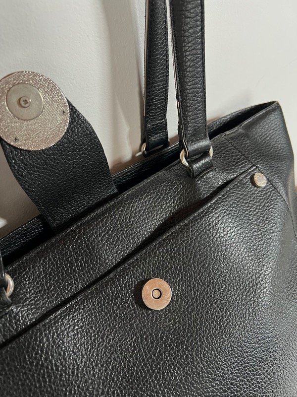 De cuero vacuno, súper amplia. Ideal para el día a día, entra de todo. Sus medidas son 39cm de ancho por 26cm de alto. Bolsillo exterior que cierra con botón imantado.