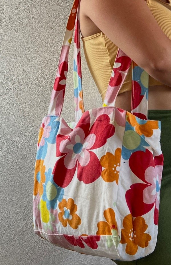 Tote bag de tela. Estilo playera. Es bastante amplia, entra toalla/manta, termo, cuadernos.